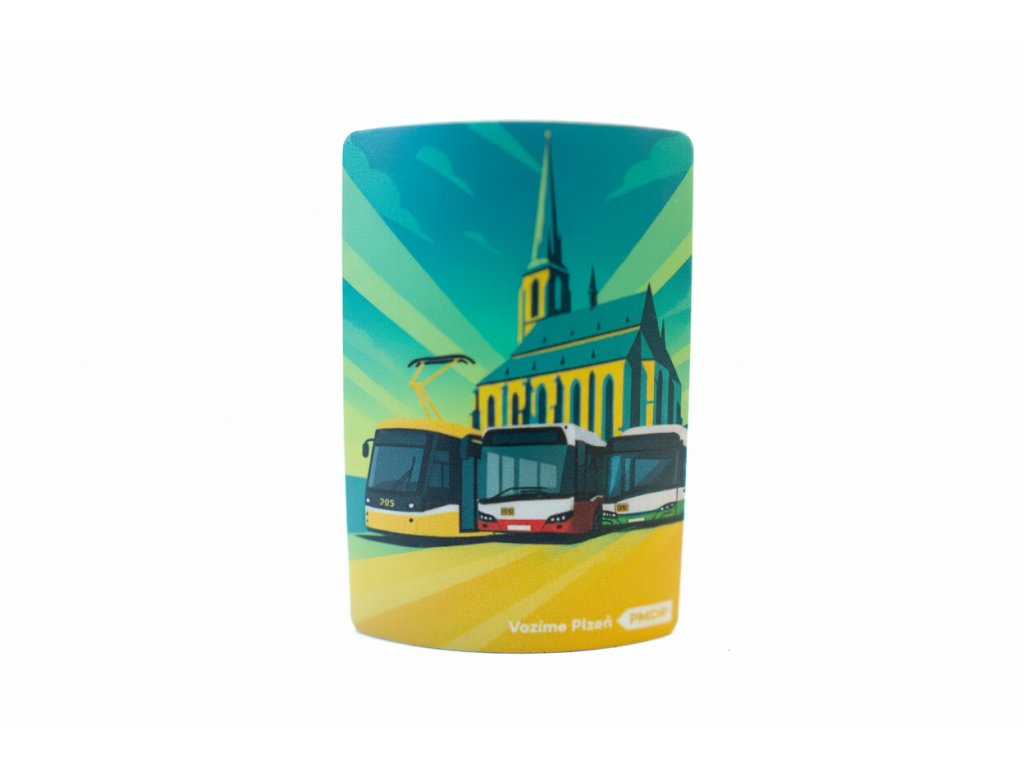 Stylová magnetka s motivem plzeňské katedrály a vozidel MHD, která rozzáří každou lednici i nástěnku.